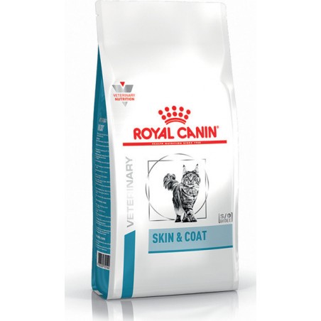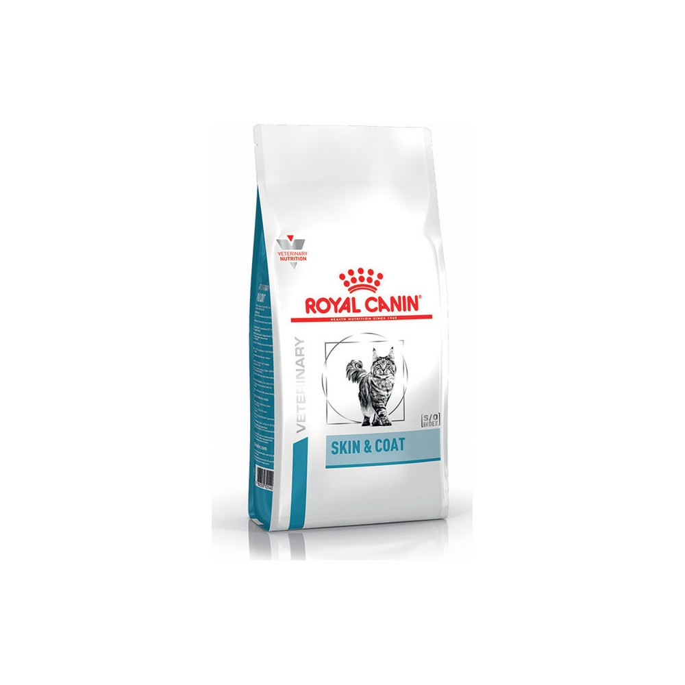 Η Royal Canin Veterinary Diet Feline Skin & Coat είναι μία πλήρης τροφή για νεαρές και ενήλικες, στειρωμένες γάτες που είναι επιρρεπείς σε δερματικά προβλήματα. Η συνταγή αυτής της ξηράς τροφής είναι ειδικά σχεδιασμένη για να υποστηρίζει την υγεία του δέρματος και του τριχώματος. Περιέχει συστατικά όπως DHA και EPA που συμβάλλουν σε ένα υγιές δέρμα και λαμπερό τρίχωμα. Η τροφή ενδείκνυται για γάτες με ατοπικό έκζεμα ή άλλες μορφές δερματίτιδας, όπως αλλεργικές δερματικές αντιδράσεις ή δερματικά προβλήματα λόγω παρασίτωσης ή μολύνσεων. Η συγκεκριμένη ξηρά τροφή έχει υψηλή περιεκτικότητα σε πρωτεΐνη και συμβάλλει στη διατήρηση της μυϊκής μάζας. Επιπλέον, με το δείκτη οξύτητας S/O δημιουργείται ένα περιβάλλον στα ούρα, το οποίο προλαμβάνει τον σχηματισμό και επανασχηματισμό λίθων στην ουροδόχο κύστη.